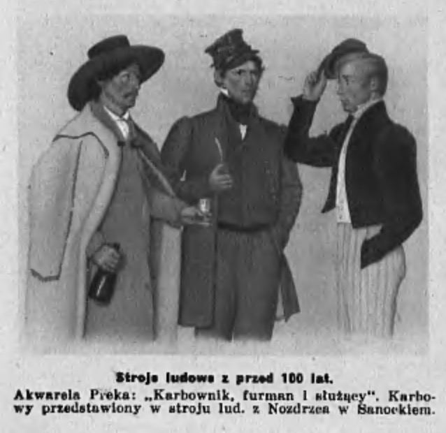 Кой зас посмотриме на мапу, наш позір притягне чорна цятка далеко на пілночы, ген поза Сянік – №83. Чорна цятка (IV за лєґендом мапы) значыт, што в тім місци была одзначена чуга білой барвы, №83 вказує на Nozdrzec. Село Nozdrzec, по-рускы Ніздрец, уж давно спольщене і етноґрафічно положене на земли pogórzan. Выходит, же в тых сторонах люде тїж колиси носили чугы, лем білы? Деси так і выходит 🙂 …але найцєкавішше, жезме бы ся ниґда того не дізнали, якбы не єден маляр – Franciszek Ksawery Prek. Родил ся в Ніздреци далекого 1801-го рока, задолго до бадан професора Райнфуса, і лишыл по собі єденацет акварелий, де змалёвал люди в іх народнім строю. Так на єдной акварели (около 1840-го рока) стоят трёх хлопів. Двох тых хлопів уж вбраты на міску моду, але єден хлоп, karbownik (першый злїва), щы вбратый w stroju lud. z Nozdrzca w Sanockiem. На жаль, тота акварель была опублїкована лем раз – в єднобарвній формі з куртым коментарём о строю карбовника: «strój karbowego poza zróżnicowaniem barwnym (biala gunia, niebieski kabat, czarny kapelusz) nie wyróżnia się żadną ornamentyką».