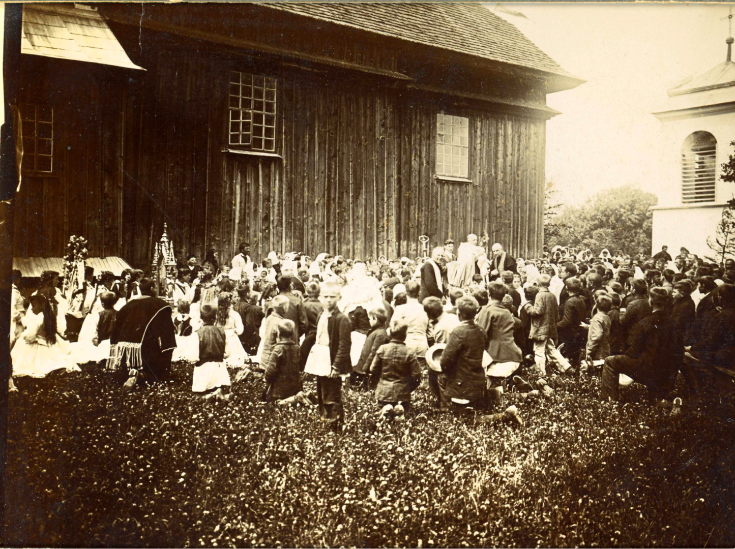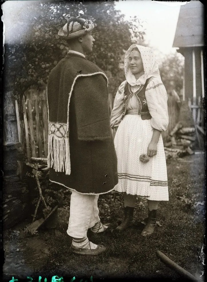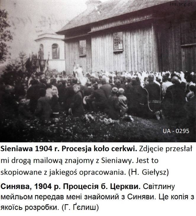б) Уникальном знимком церковной процесиі 1904-го рока (жем єй однашол на Losy Niezapomniane), де видиме дває ґаздів: першый вбратый в чуганю з подібном оздобом (лем без торочків), а другый, што цєкаво, в чуганю о тім самім крою, лем уж без жадной оздобы: