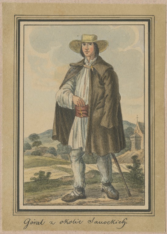 Акварель К. В. Келїсїнского «Góral z okolic Sanockich» (медже 1834 і 1839). Хоцкы гев не видиме оздобы, але видиме сам факт ношыня чугы під Сяноком:
