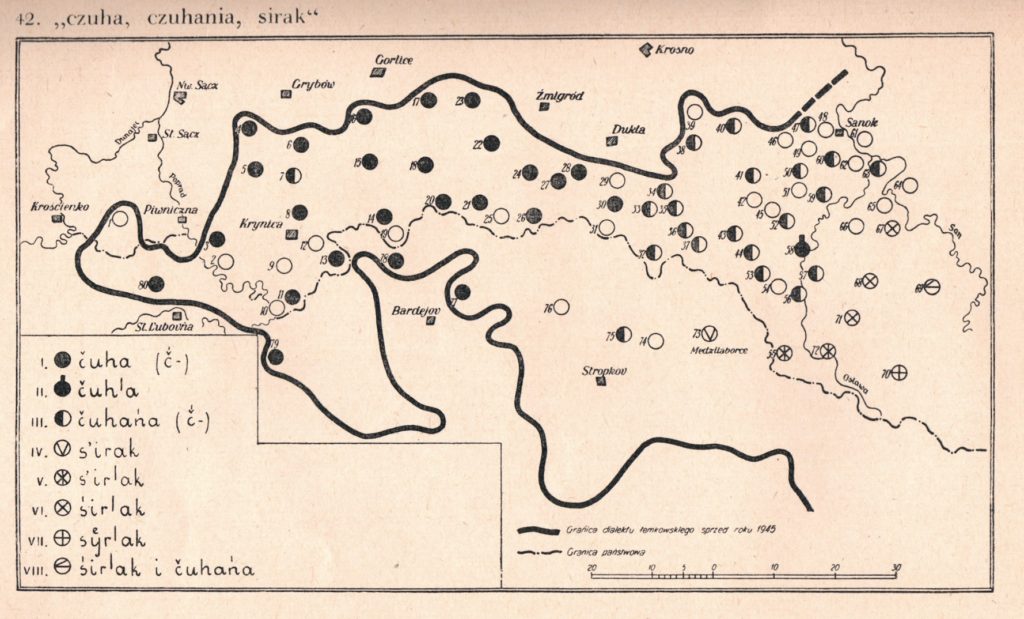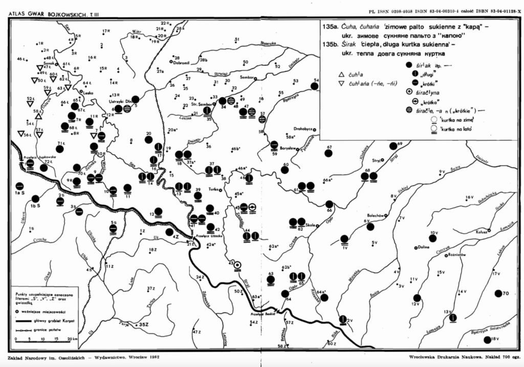 Отже, праві підышли зме до «істины» 🙂 Перше, на пілночы гісторичной Сяніччыны, коло міста Березова, люде носили білы чугы без орнаментикы і торочків, а называли іх, правдоподібнї (як і решта погужан), чува. Другє, коло самого серця Сяніччыны, міста Сянока, люде носили звыклы лемківскы чугы з торочками, а называли іх, як і властивы лемкы на полудне Сяніччыны, чуга́ня. Хіснованя слова чуга́ня аж при Сяноку, в селї Сянічок, потверджуют языковы мапы З. Штибера та Я. Риґєра (мапы подаю без іх коментарів):