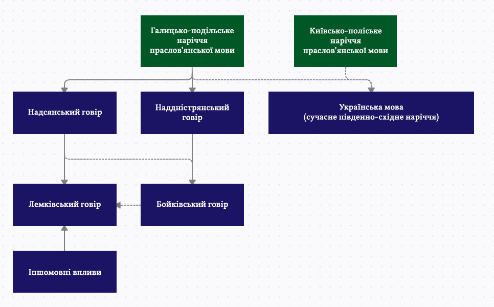 2. Носїї тых долівскых галицкых диялєктів зачали іти в горы і до кінця XIII сторіча сформовали основу лемківского (з надсянского) а бойківского (з надднїстрянского) диялєктів.