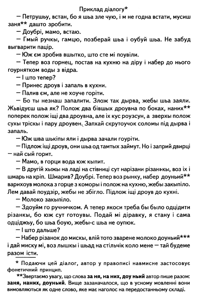 А тепер наведу ищы кілька цєкавых языковых фактів з той стороны… село Телёва: добрі описує телёвску гвару Петро Кырпан в своєй книжцї «Порвані Коралі – Роздуми про село Тилява». Окрем даякых гваровых рис и слівника, п. Петро наводит куртый приклад бесїды зо свого села: