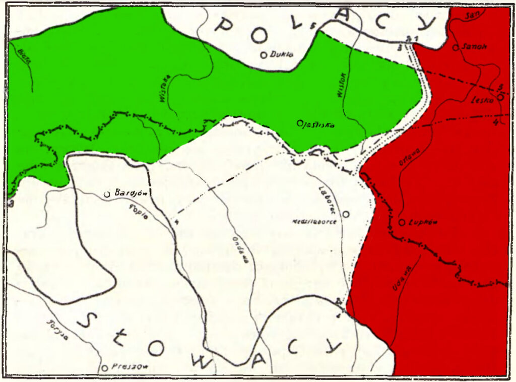 Зеленом барвом означено властивы лемківскы гвары, а червеном – переходовы од / до лемківскых гвары (на основі мапы З. Штибера)