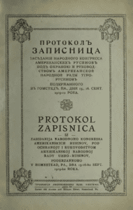 Records from the September 1919 founding meeting of the National Congress of American Rusyns, a new political body organized by its predecessor, the American National Council of Uhro-Rusyns. A report by Gregory Zhatkovych dealt with the situation in Europe and the expected Rusyn self-determination. The account of ANCUR’s history by Julius Gardoš’ also features the text of the Council’s memorandum presented to U.S. President Woodrow Wilson in October 1918. The Congress also agreed some details of the Rusyn territory’s status within Czechoslovakia (e.g. state symbols). The publication also names ANCUR executive board members, as well as the delegates present at the meeting.